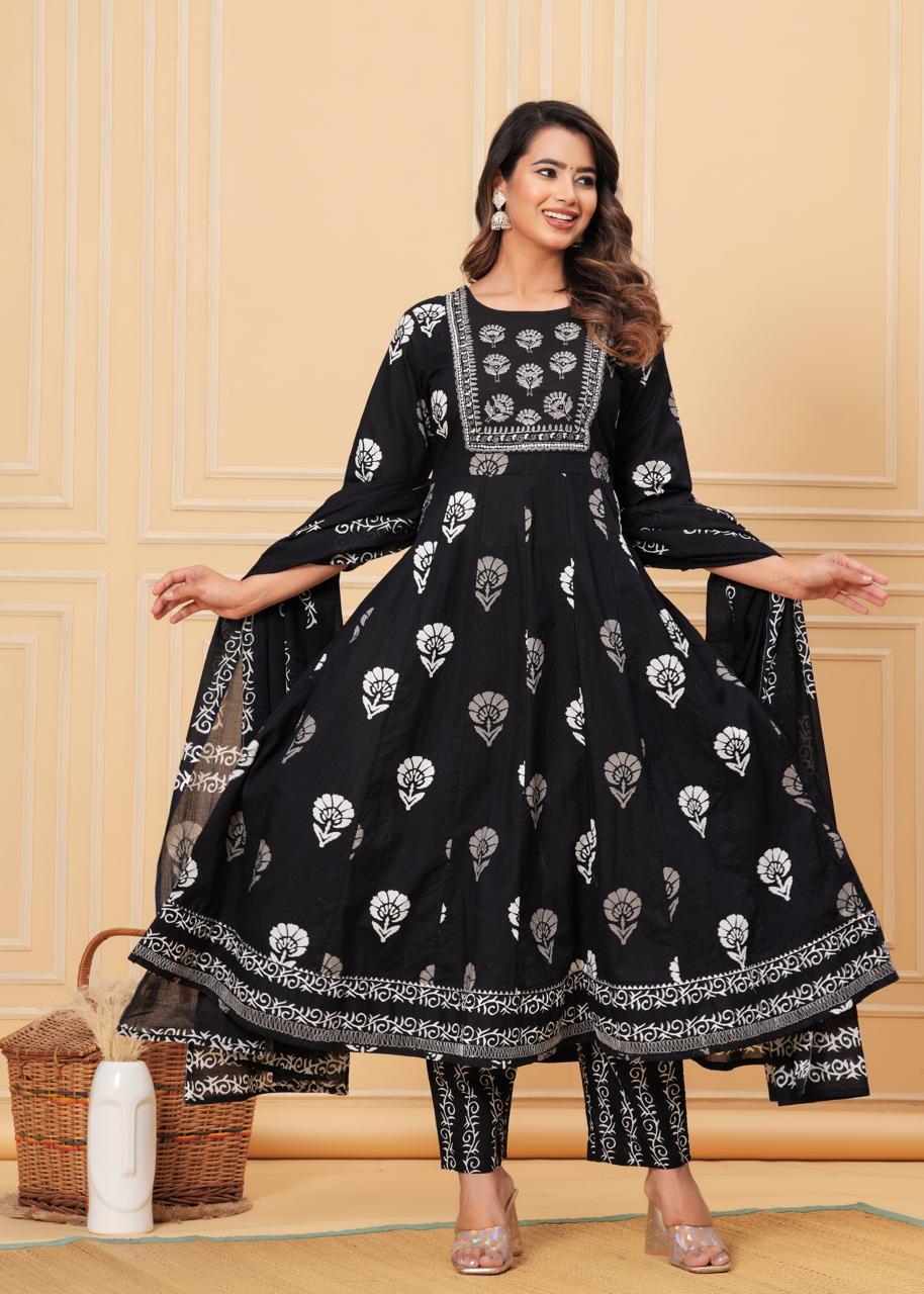 Experience elegance and comfort with our Cotton Anarkali Suit in black! Made from soft cotton and featuring a beautiful block print design and embroidered neckline, this suit is perfect for any occasion. Complete your look with the cotton printed dupatta and pants with pocket for added convenience. Elevate your style effortlessly!