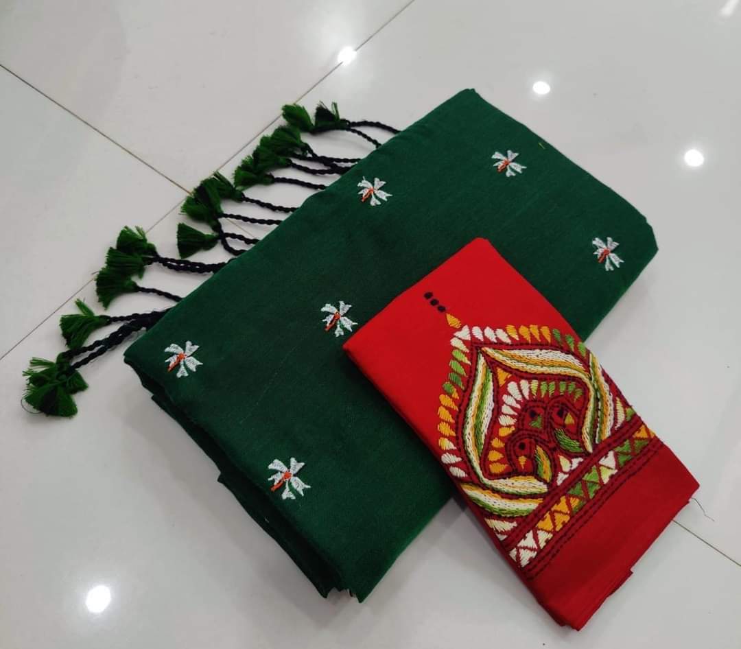 Upgrade your traditional attire with the Shiuliful Embroidery Handloom Saree. The beautiful contrast katha stitch blouse adds a touch of elegance, while the pom pom detailing on the pallu adds a playful twist. Perfect for any occasion, this saree combines style and comfort effortlessly.