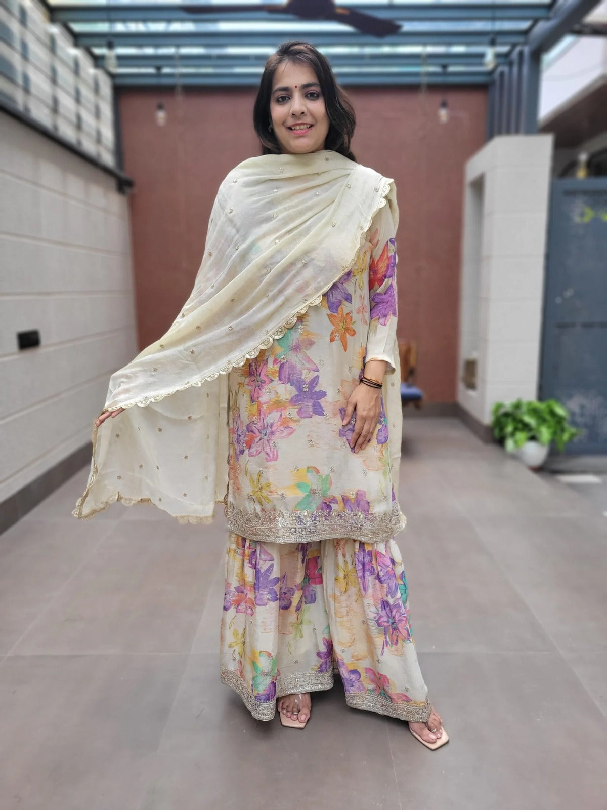 The Tissue Digital Partywear Sharara 3Pc Set exudes refined elegance, adorned with intricate all-over zari work that highlights meticulous craftsmanship. Its cotton-lined sharara offers both comfort and style, while the delicate tissue silk dupatta, embellished with exquisite zari detailing, completes this sophisticated ensemble. Ideal for discerning celebrations, this set seamlessly blends traditional artistry with graceful modernity.